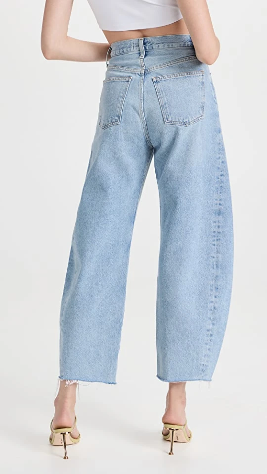 A uniquely shaped wide leg draws the eye to these AGOLDE jeans, which gain a touch of timeless style from a faded, light-blue wash and frayed cuffs.