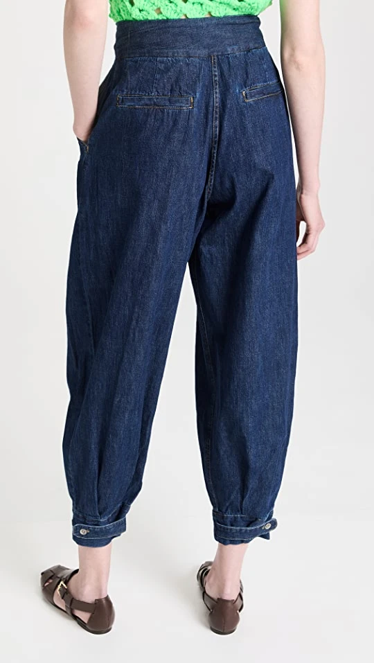 - Pleated waist with hook-and-eye closures and zip fly